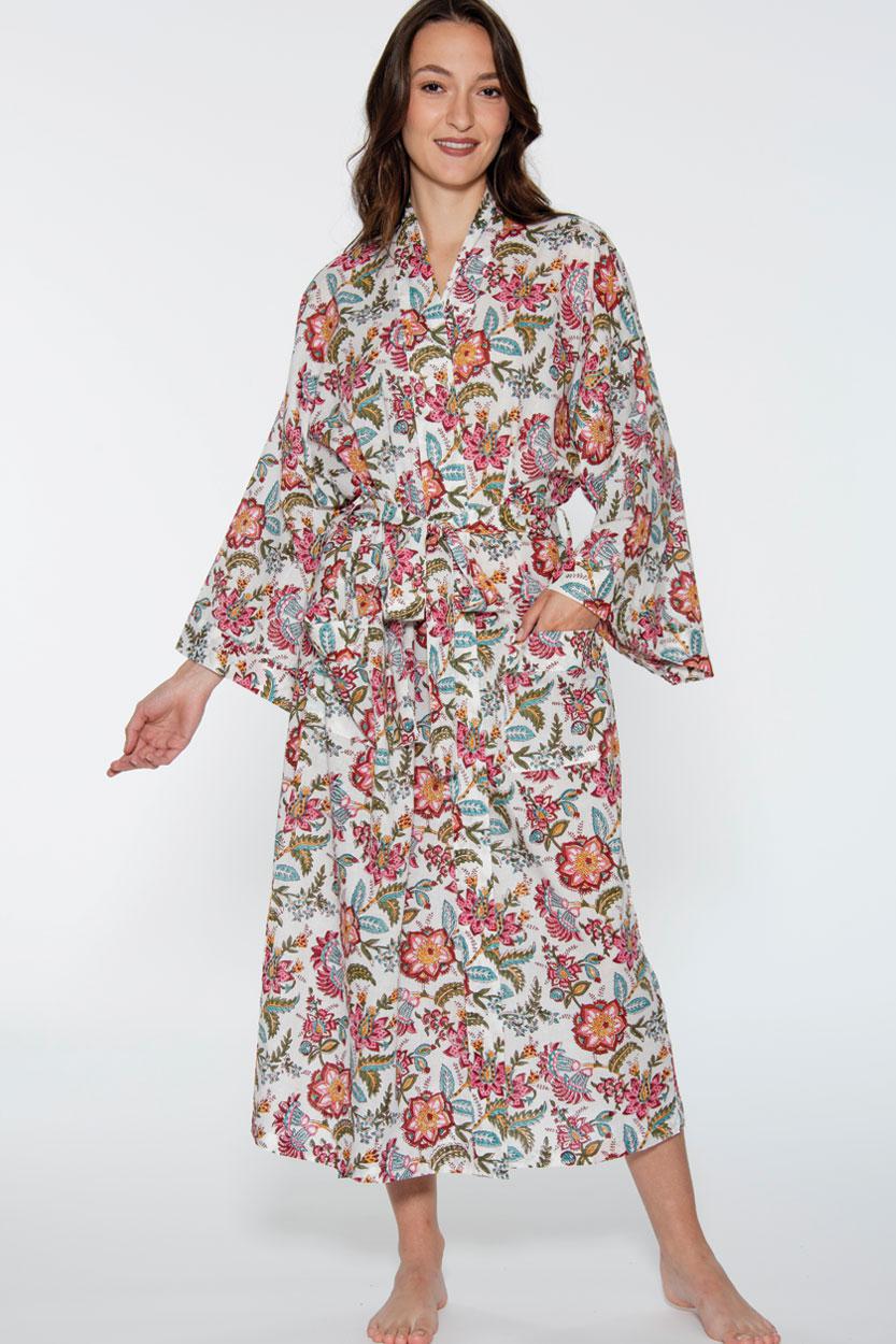 This long Ivory Multi Kimono Robe is hand block-printed on soft 100% cotton material by artisans in Rajasthan, India. The wooden blocks are first hand-carved and the design is then hand-stamped using a different block for each color in the pattern. The seamless printing shows the fine skill of the block-printers, and it is a craft that has been passed down from generation to generation. Each region of India has a different style of block-printing, and each family has their own collection of wooden blocks.