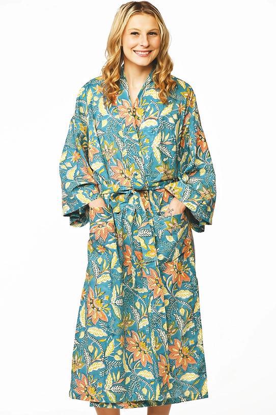 This long turquoise Kimono Robe is hand block-printed on soft 100% cotton material by artisans in Rajasthan, India. The wooden blocks are first hand-carved and the design is then hand-stamped using a different block for each color in the pattern. The seamless printing shows the fine skill of the block-printers, and it is a craft that has been passed down from generation to generation. Each region of India has a different style of block-printing, and each family has their own collection of wooden blocks.