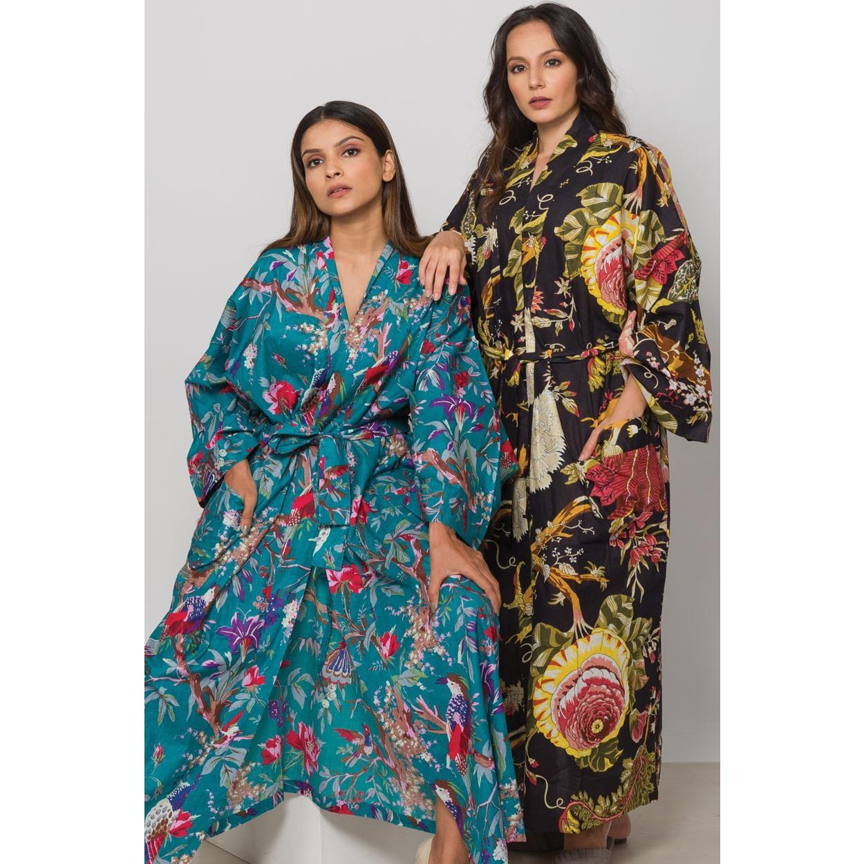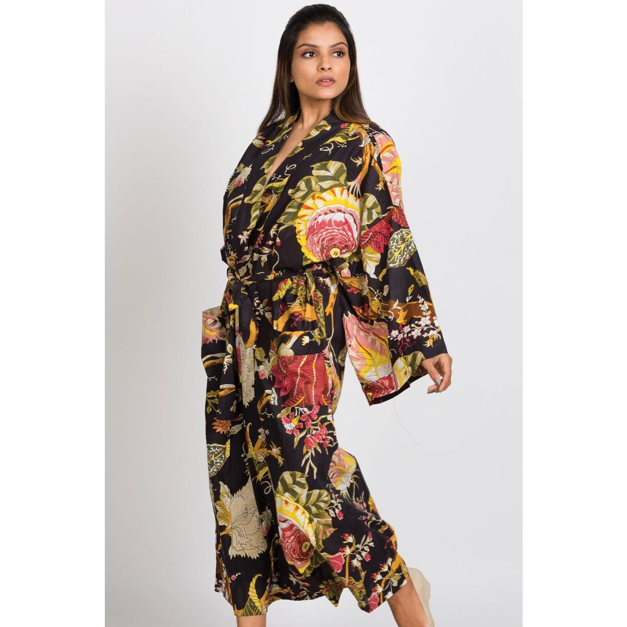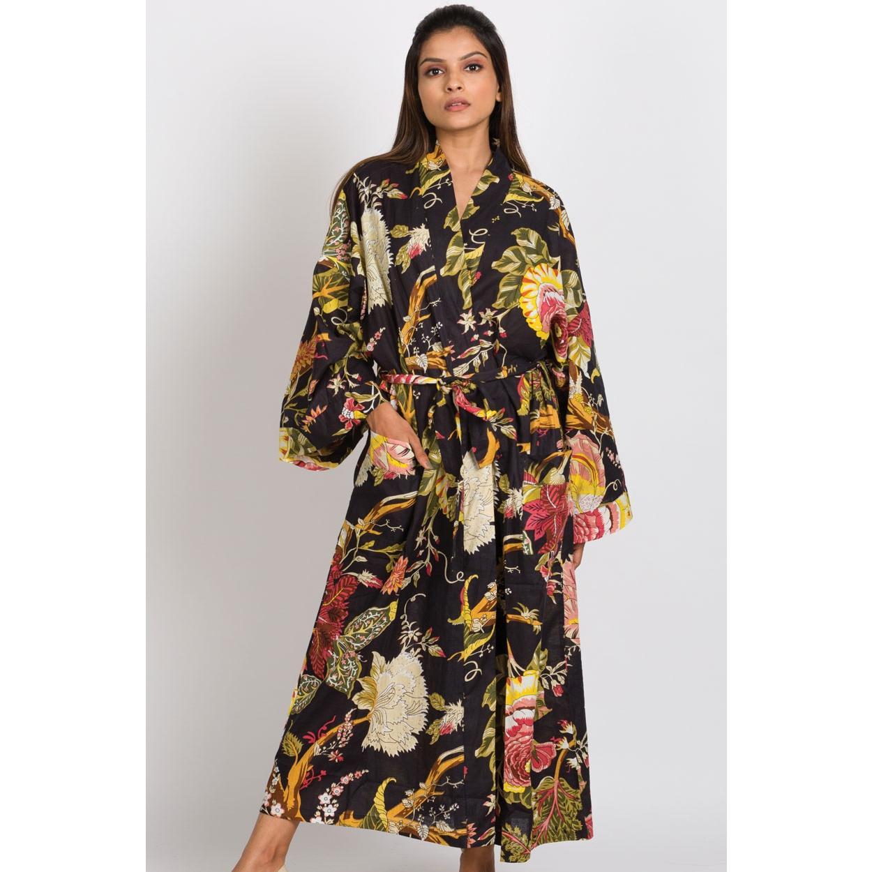 Our gorgeous Black & Rose Long Kimono Robe is luxuriously comfortable. The design highlights vibrant and unique artistic prints on 100% buttery soft cotton. Highly skilled artisans use eco-friendly dyes to make the prints and colors come alive on the fabric.