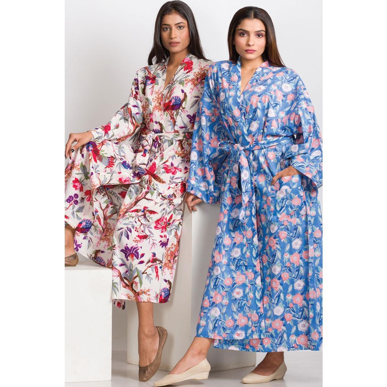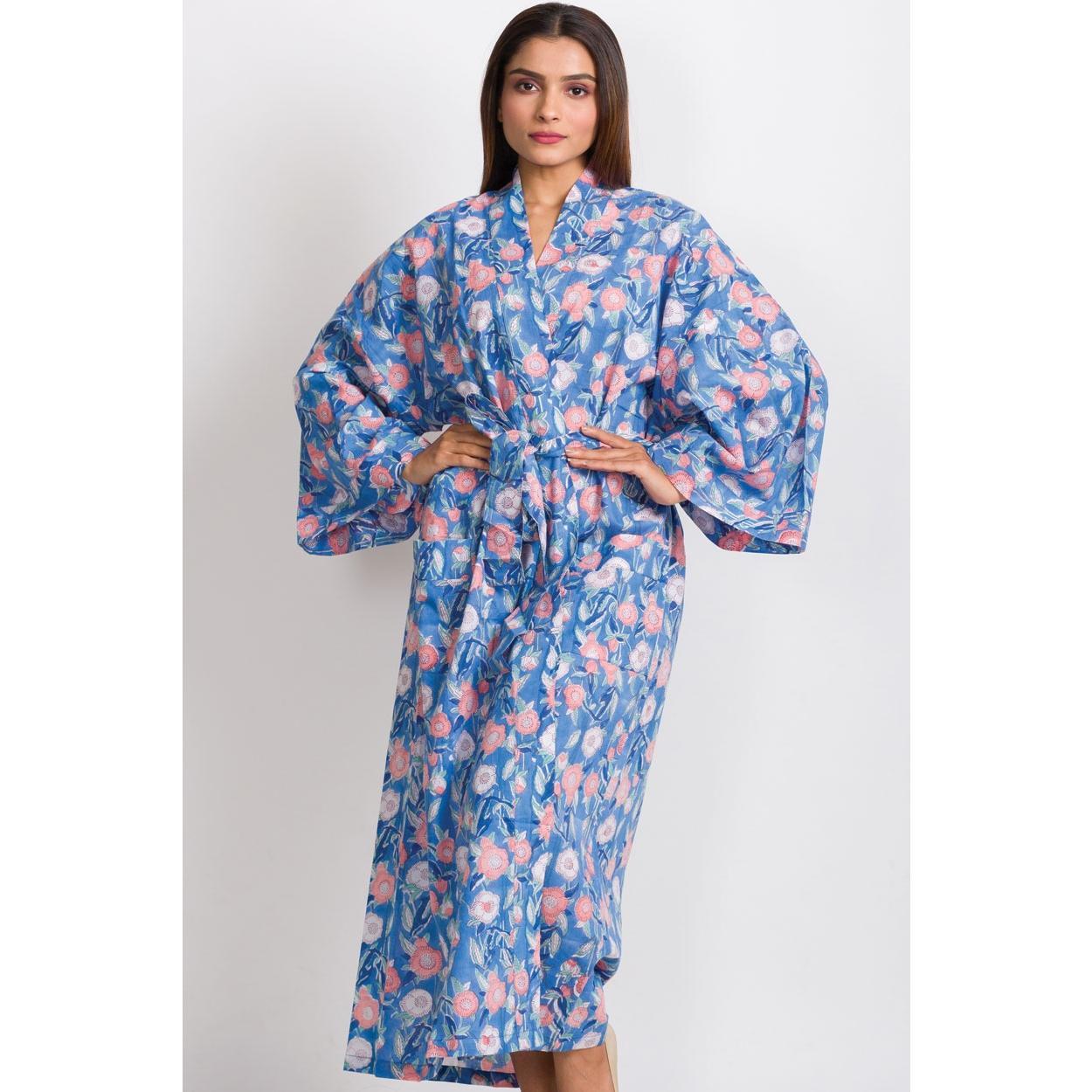 Our gorgeous Blue Poppies Long Kimono Robe is luxuriously comfortable. The design highlights vibrant and unique artistic prints on 100% buttery soft cotton. Highly skilled artisans use eco-friendly dyes to make the prints and colors come alive on the fabric.