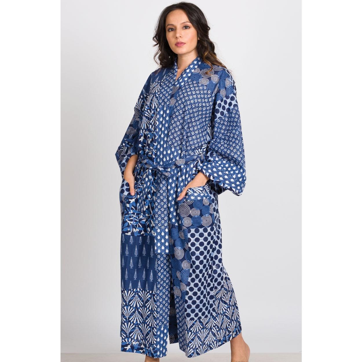 Our gorgeous Patchwork Indigo Long Kimono Robe is luxuriously comfortable. The design highlights vibrant and unique artistic prints on 100% buttery soft cotton. Highly skilled artisans use eco-friendly dyes to make the prints and colors come alive on the fabric.