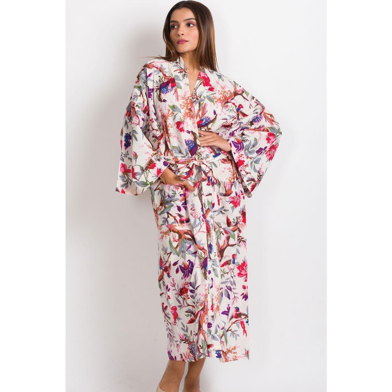 Our gorgeous Ivory Multi Birds Long Kimono Robe is luxuriously comfortable. The design highlights vibrant and unique artistic prints on 100% buttery soft cotton. Highly skilled artisans use eco-friendly dyes to make the prints and colors come alive on the fabric.