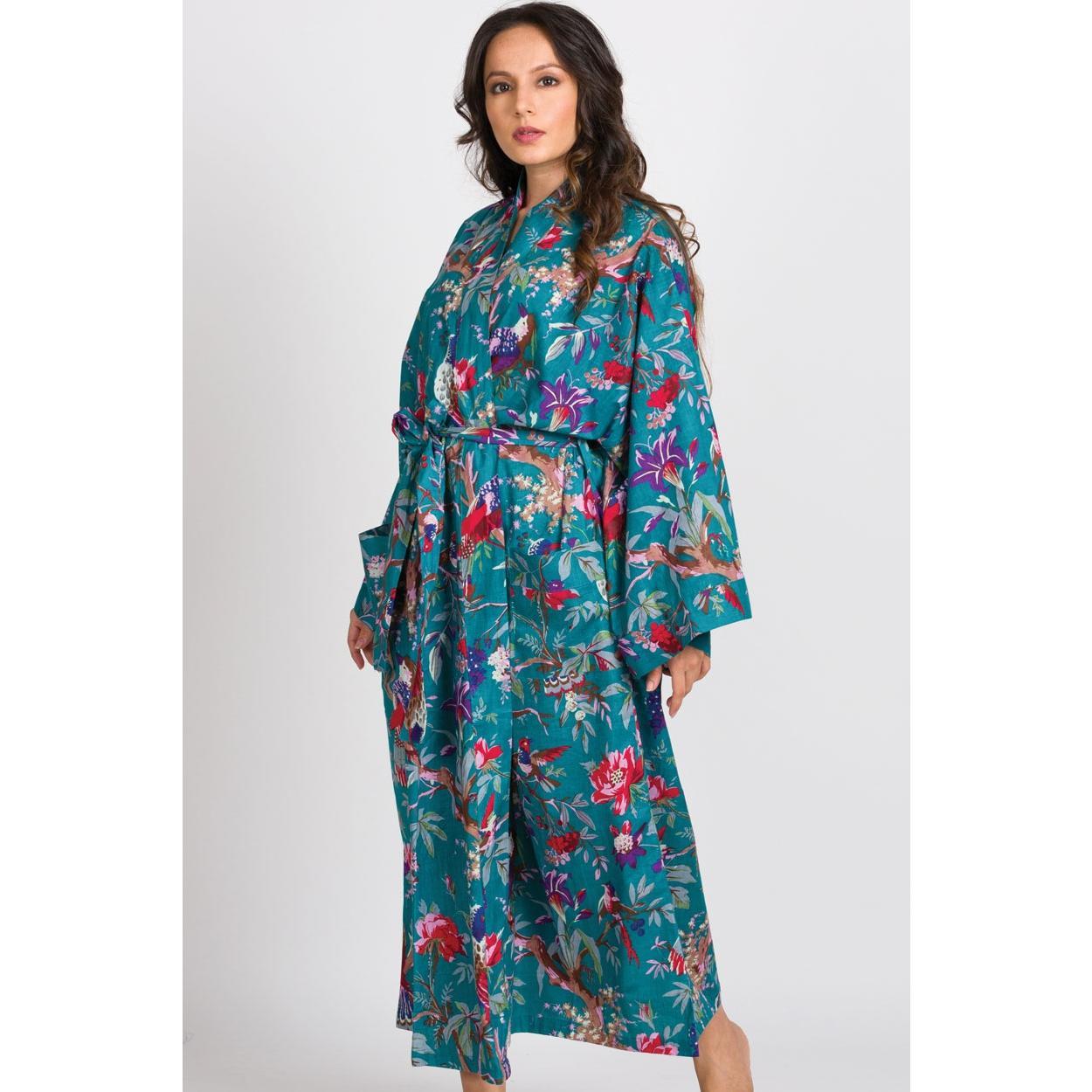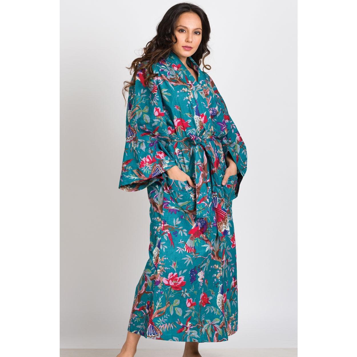 Our gorgeous Teal & Rose Long Kimono Robe is luxuriously comfortable. The design highlights vibrant and unique artistic prints on 100% buttery soft cotton. Highly skilled artisans use eco-friendly dyes to make the prints and colors come alive on the fabric.