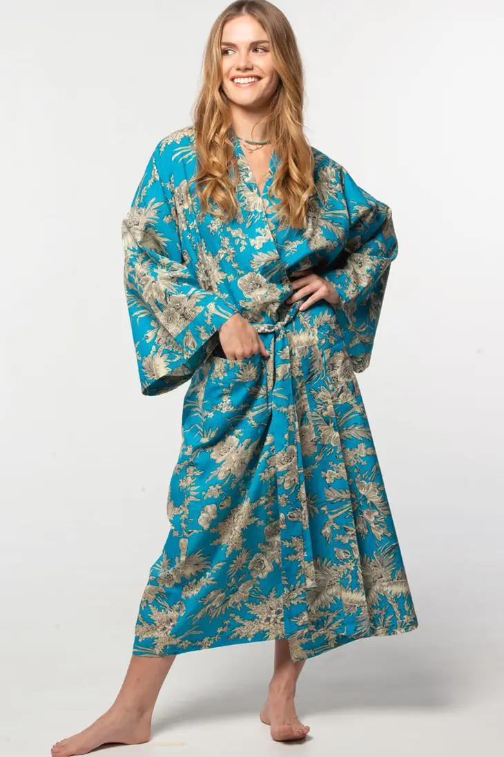 Our gorgeous Turquoise & Gold Long Kimono Robe is luxuriously comfortable. The design highlights vibrant and unique artistic prints on 100% buttery soft cotton. Highly skilled artisans use eco-friendly dyes to make the prints and colors come alive on the fabric.